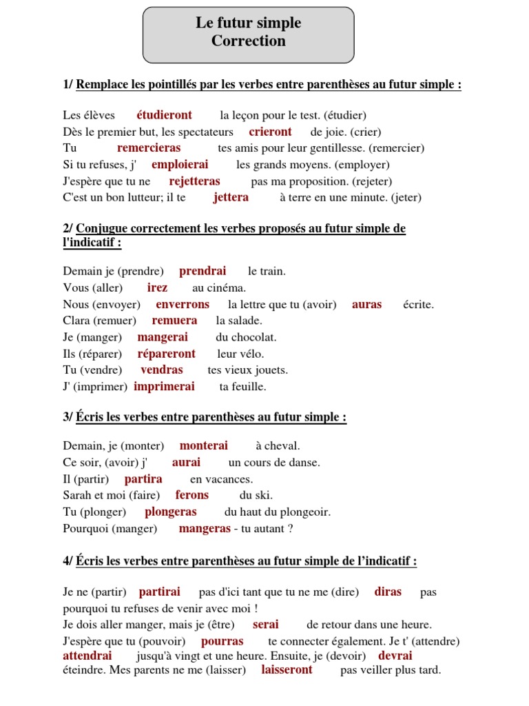 Exercices corrigés à imprimer de la catégorie passé, présent, futur : • le garagiste réparera la voiture. 2/ conjugue les verbes entre parenthèses au futur simple : Retrouvez ici les tableaux de conjugaison des verbes comme chanter, grandir, faire, être et avoir au futur. Avoir j'a ur ai 2.